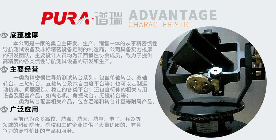 公司主要優勢在精密加工、精密測量、精密設備。公司產品主要為精密慣性導航測試轉臺系列,包含單軸轉臺、雙軸轉臺、三軸轉臺、五軸轉臺及六自由度平臺等;也可以定制運動仿真、伺服跟蹤、穩定的各類平臺。目前已為眾多高校、航海、航天、航空、電子、兵器等領域的科研院所、院校和工礦企業提供了大量的、有競爭力的高性價比的產品和服務。